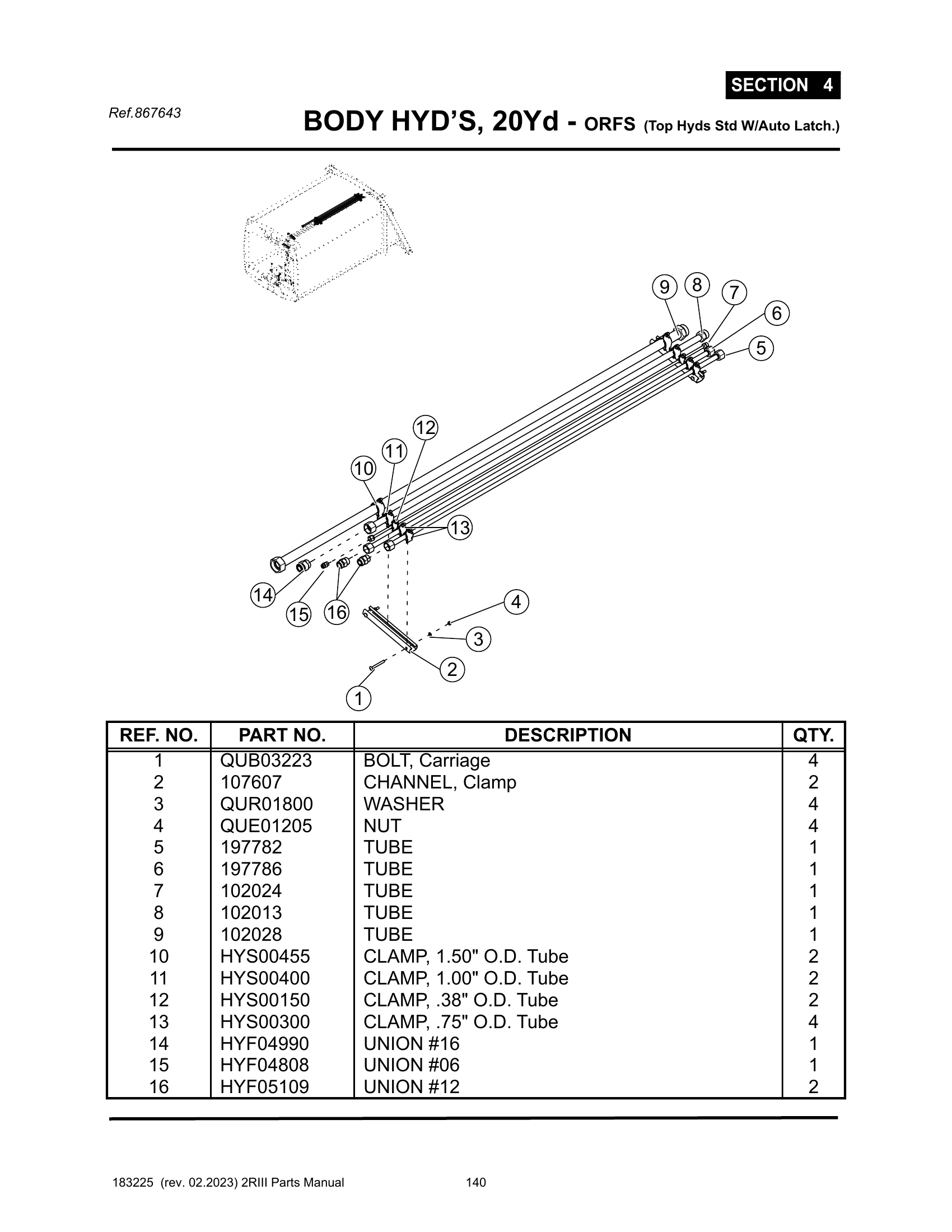2R-III - PG 140 - SECTION 4 - BODY HYD’S, 20Yd - ORFS (Top Hyds Std W/Auto Latch.)