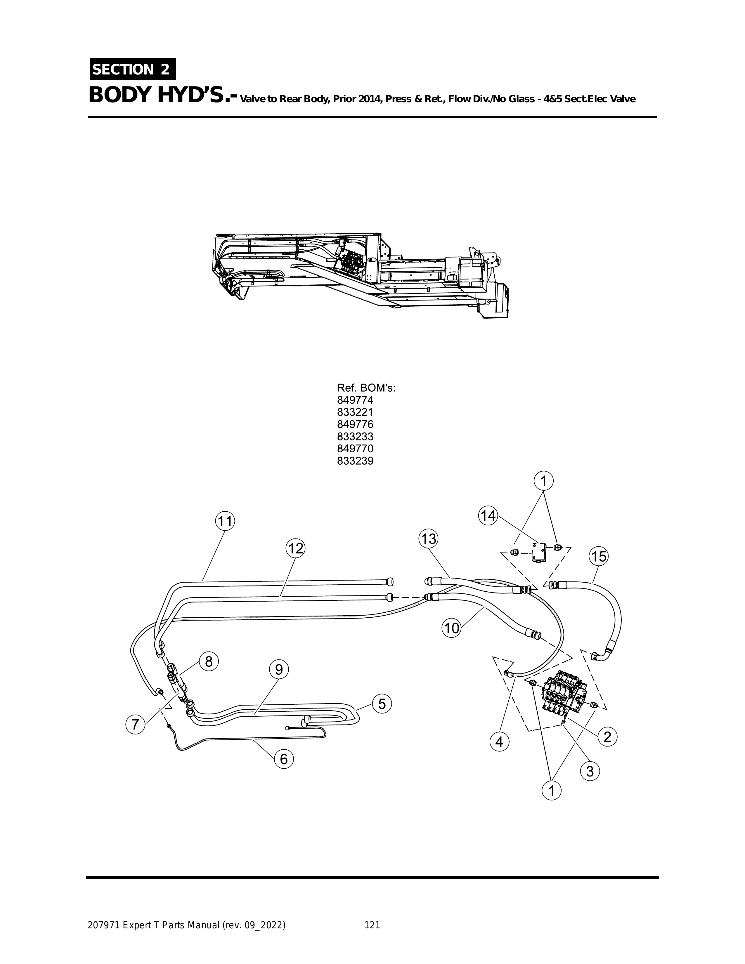 EXPERT - PG 121 - Section 2 - BODY HYD’S.- Valve to Rear Body, Prior 2014, Press & Ret., Flow Div./No Glass - 4&5 Sect.Elec Valve
